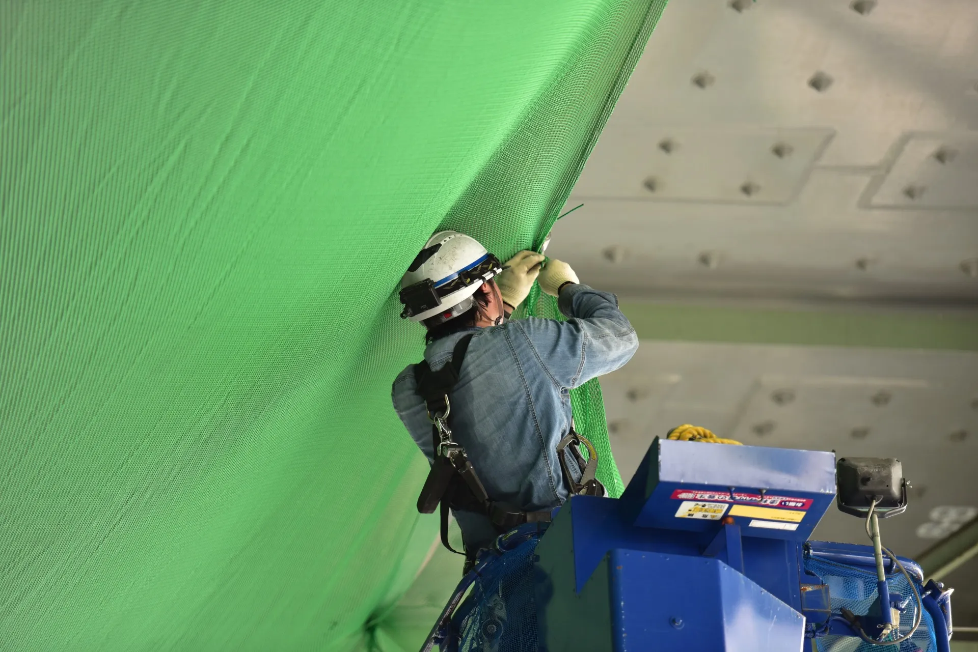 高所での作業では、フルハーネス型安全帯の着用が義務付けられている現場が多くあります。フルハーネスは肩・胸・太ももなど体全体を支える構造になっており、万が一転落した場合でも衝撃を分散し、重大事故を防ぐための装備です。正しいサイズ選びと、バックルの締め忘れがないかの確認は必須です。未経験者の場合は、研修や先輩から装着方法の指導を受けながら、毎回必ずセルフチェックを行います。ネット設置などの高所作業では「慣れ」が事故につながることもあるため、基本動作を徹底することが重要です。